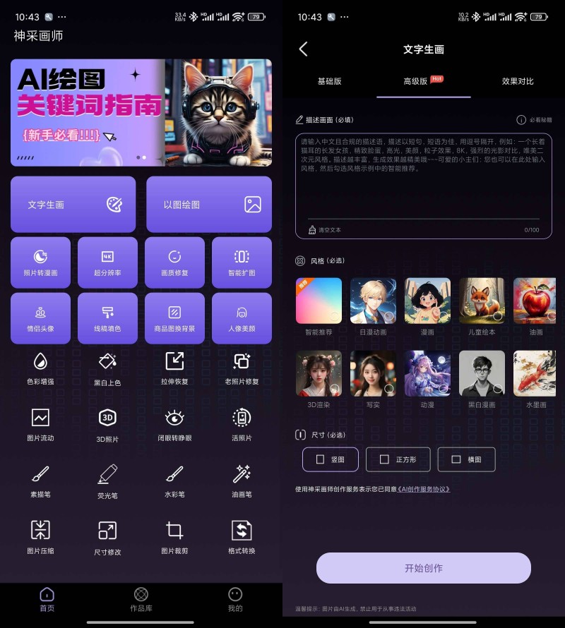 【文字生画】 一句话,让设计变得简单!涵盖汇集了目前市面上各种AI绘画模型,从二次元到CG渲染、素描插画到3D立体,你能找到任何想做的主流、小众风格。只要简单的描述咒语,就能把你的想法实现,让你的画作充满想象力,创作出属于你的艺术作品。独特的壁纸头像、徽标、诗词、歌曲歌词、你的梦想、电影角色、来自未来的事物……神采画师让你秒变大艺术家。