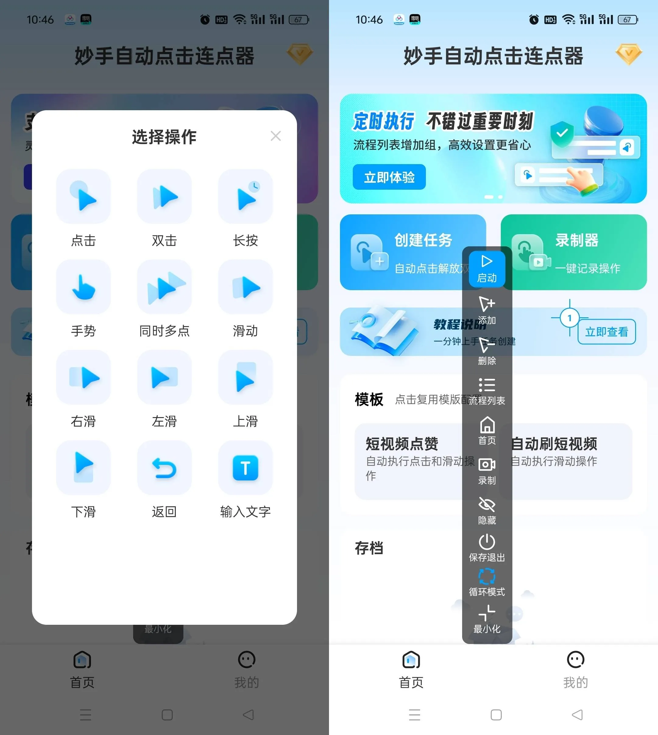 【多样化操作模拟】内置单击、双击、长按、滑动、连点、返回、手势等多种操作模板,支持基础库快速调取,精准模拟手指的点击连点等触控操作,轻松适配各类场景的基础点击需求。